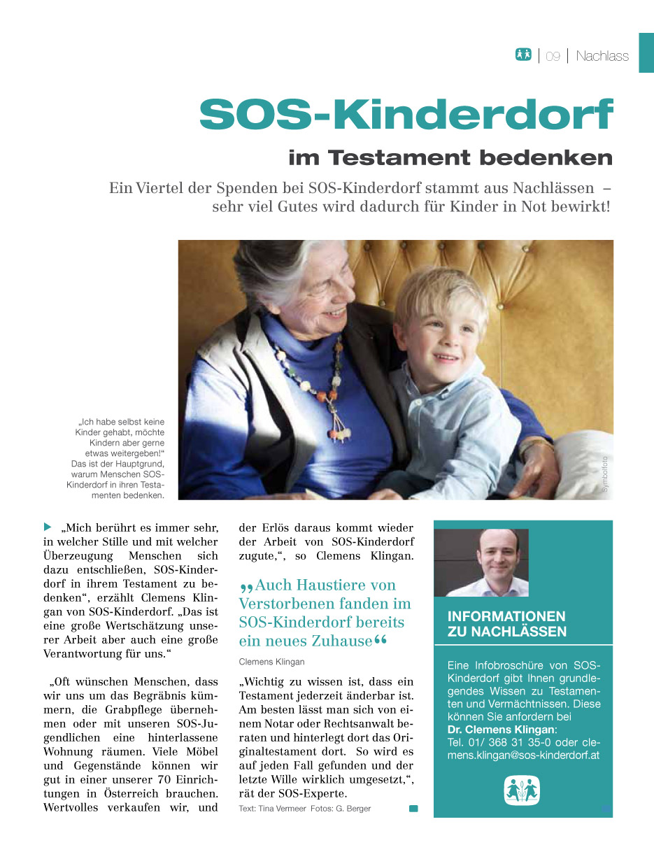 Mit August 2008 wurde in Österreich die Erbschafts- und die Schenkungssteuer abgeschafft. Das bedeutet, dass Ihr Nachlass in vollem Umfang Ihren Erben zukommt. Im Fall von SOS-Kinderdorf unmittelbar Kindern und Jugendlichen in Not. Und zwar ganz so, wie Sie dies wünschen: